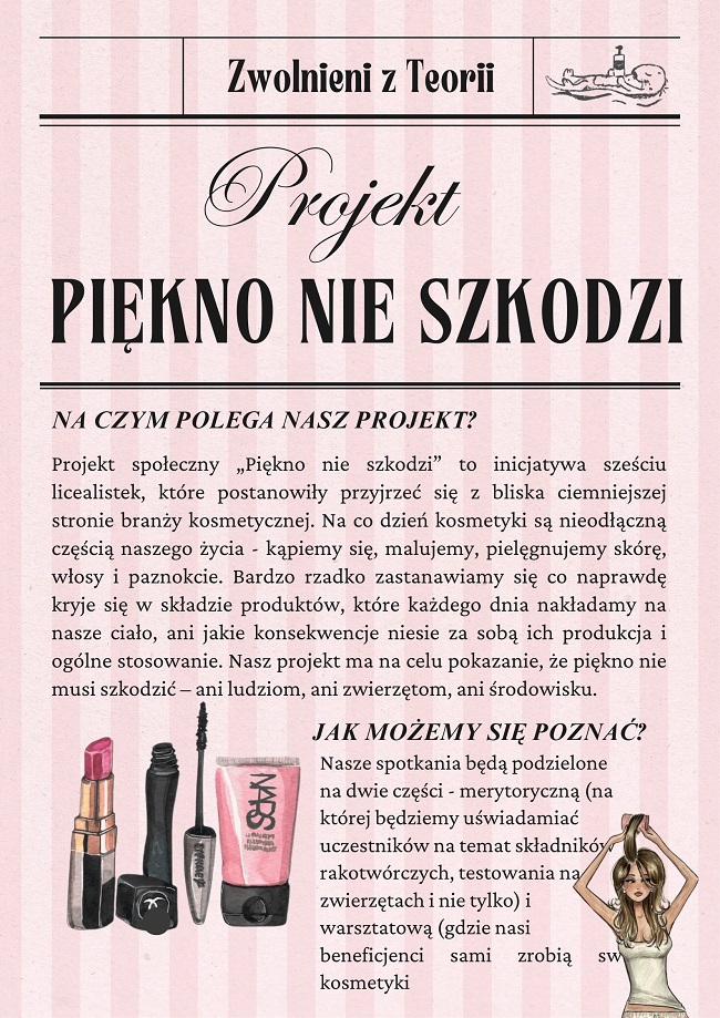 Projekt społeczny "Piękno nie szkodzi" to inicjatywa, organizowana w ramach olimpiady "Zwolnieni z Teorii", stworzona przez *sześć licealistek z Opola*, które postanowiły przyjrzeć się mniej znanej, ciemniejszej stronie branży kosmetycznej oraz przekazywać rzetelną i potrzebną wiedzę szerokiemu gronu odbiorców w szczególności młodym osobom zainteresowanym świadomą pielęgnacją oraz odpowiedzialnymi wyborami konsumenckimi.