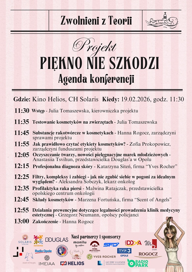 W ramach działalności społecznej projektu "Piękno nie szkodzi" już 19 lutego 2026 roku zapraszamy na konferencję edukacyjną w kinie Helios w CH Solaris o godzinie 11:30. Następnie zapraszamy na warsztaty, na których nasi beneficjenci stworzą własne naturalne kosmetyki. Podczas wydarzenia wystąpią zaproszeni prelegenci, m.in. pani Marzena Fortuńska z firmy Scent of Angels, przedstawicielka firmy "Yves Rocher", przedstawicielka perfumerii Douglas w Opolu oraz pan Grzegorz Neumann i wiele innych.